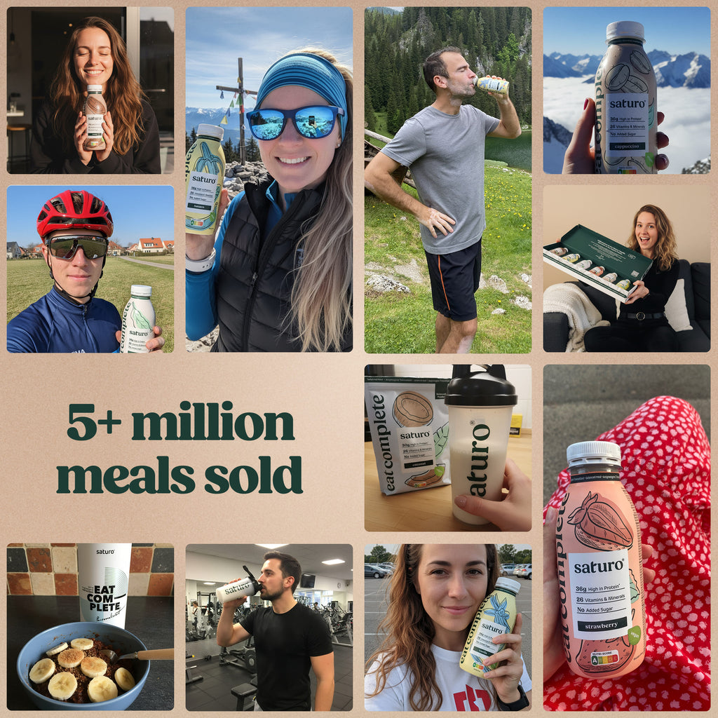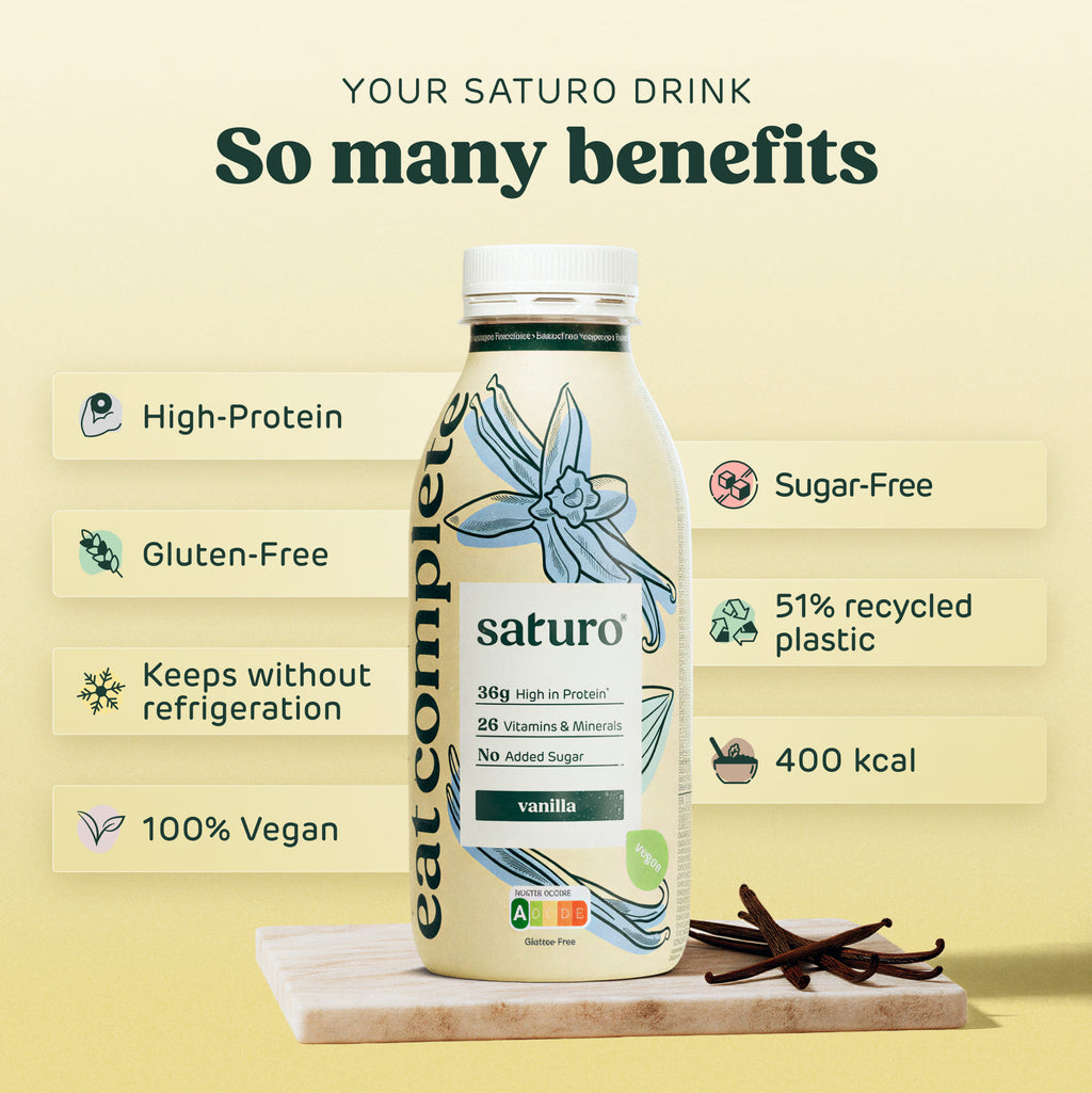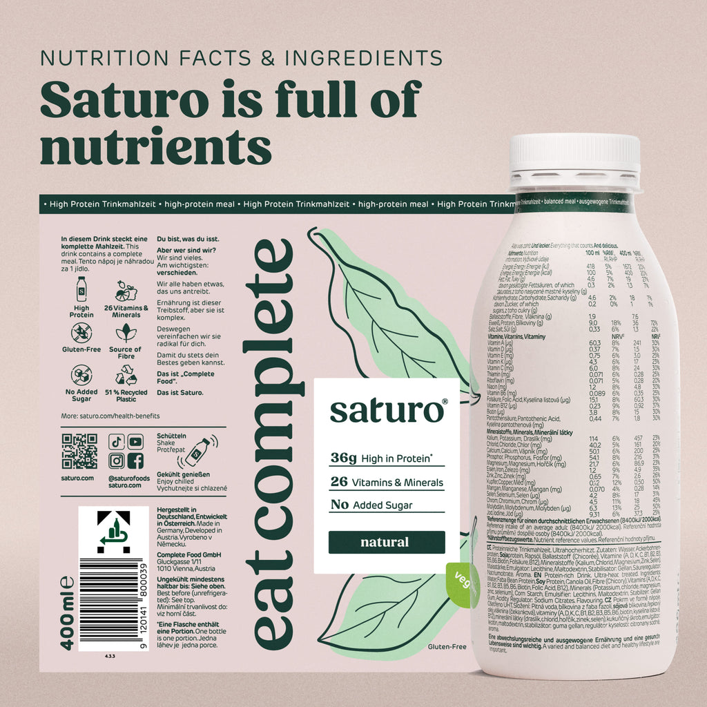 Každé pitné jídlo vám zajistí optimální zásoby – s 36 g bílkovin, komplexních sacharidů, spoustou vlákniny a všech 26 základních vitamínů a minerálů. V Saturo Nápojové jídlo obsahuje vše, co potřebujete. A navíc je veganský a bez cukru.