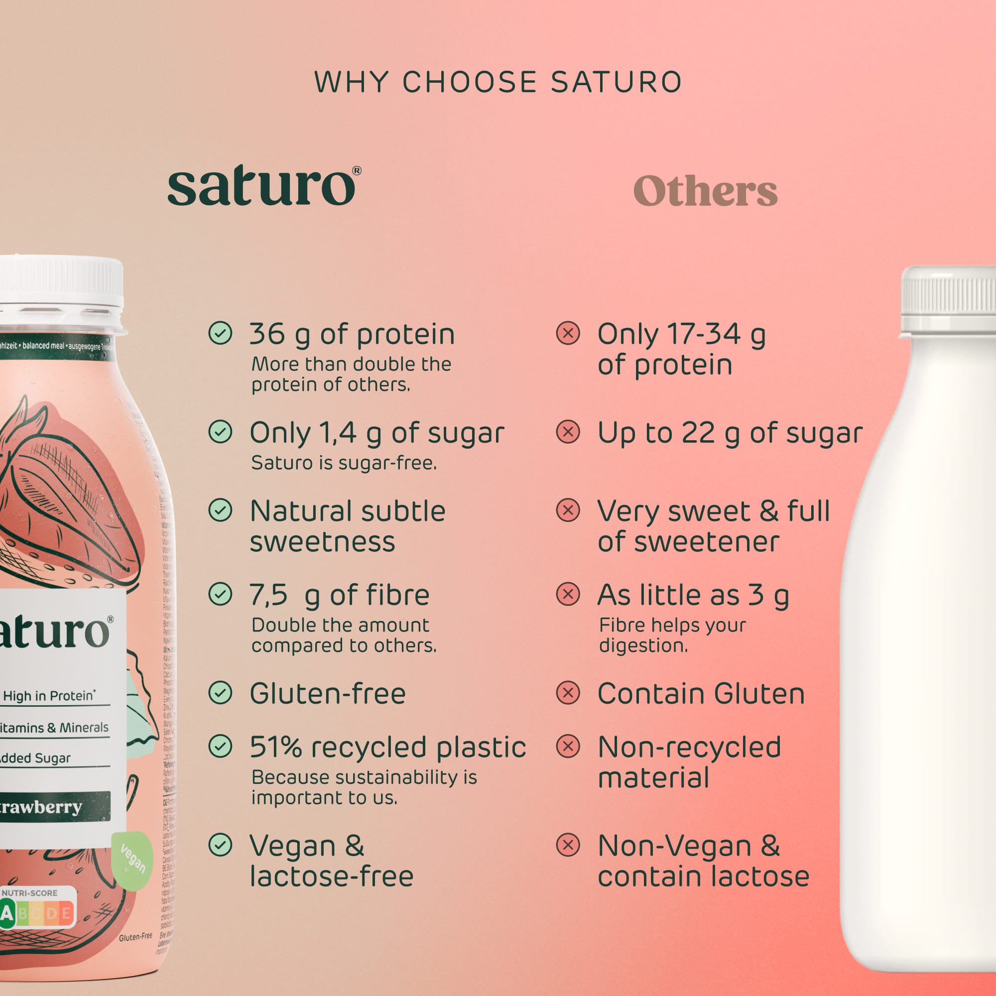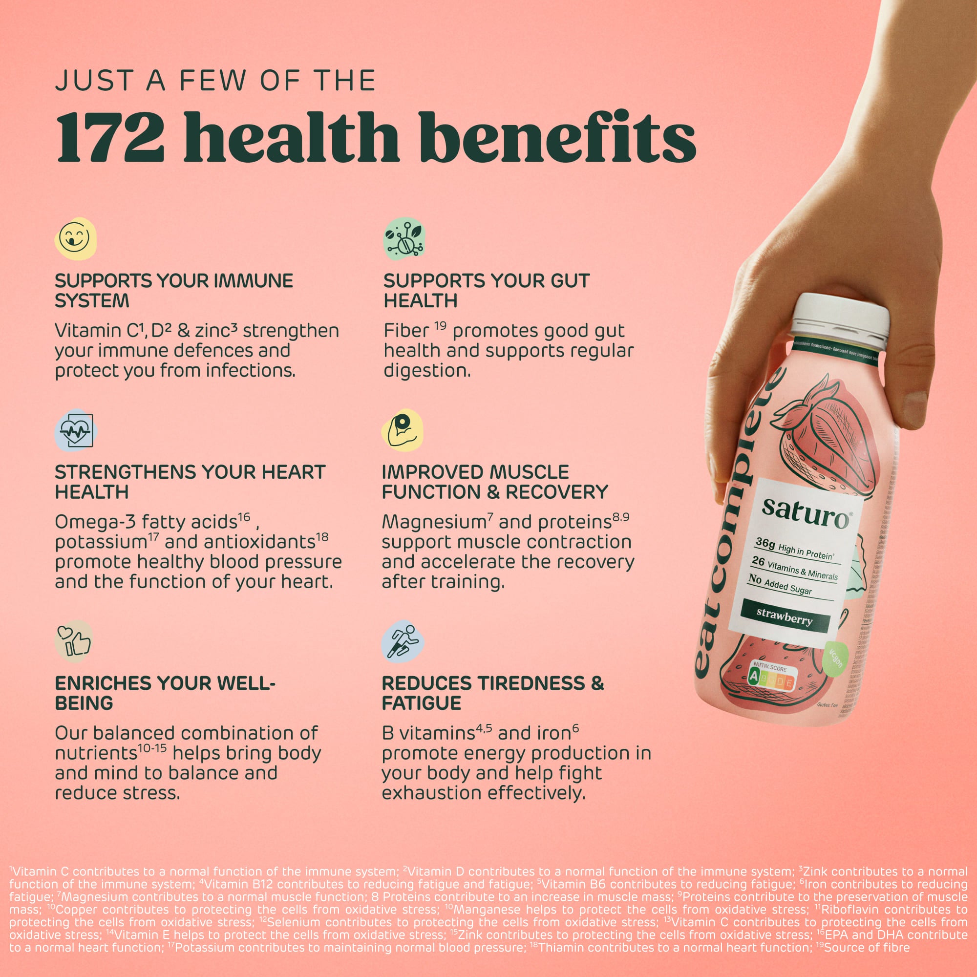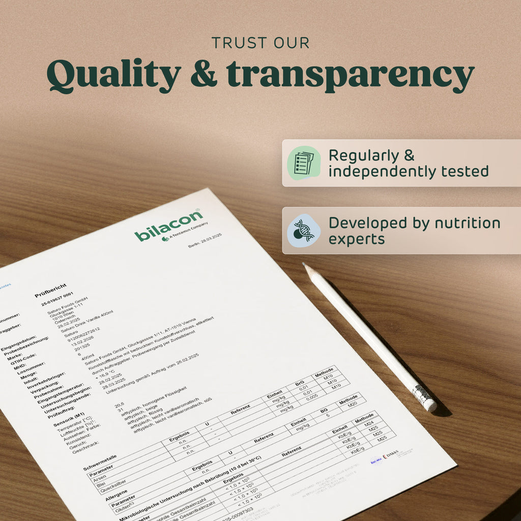 Každé pitné jídlo vám zajistí optimální zásoby – s 36 g bílkovin, komplexních sacharidů, spoustou vlákniny a všech 26 základních vitamínů a minerálů. V Saturo Nápojové jídlo obsahuje vše, co potřebujete. A navíc je veganský a bez cukru.