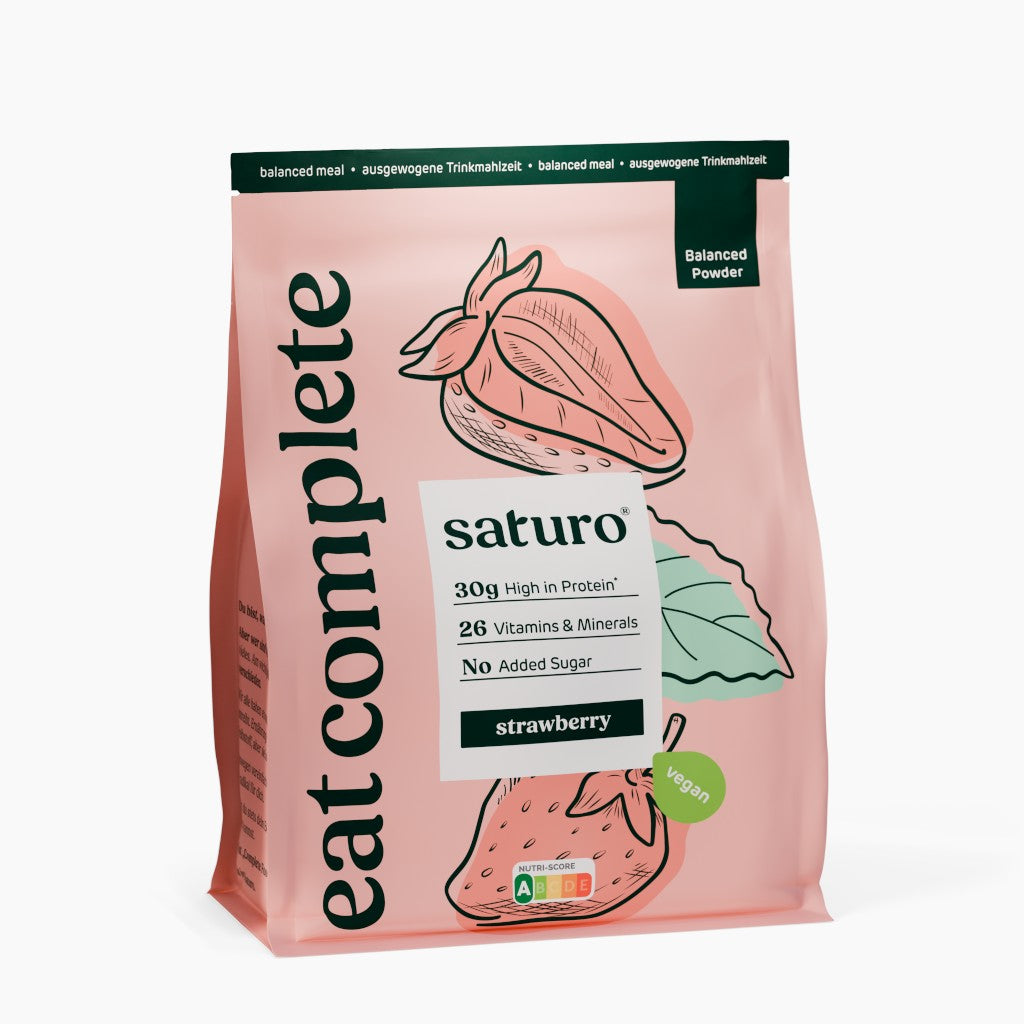 Each shake provides you with a really good supply of 30 g of protein, complex carbohydrates, all 26 essential vitamins and valuable minerals. Saturo Powder contains everything you need, and it's vegan.