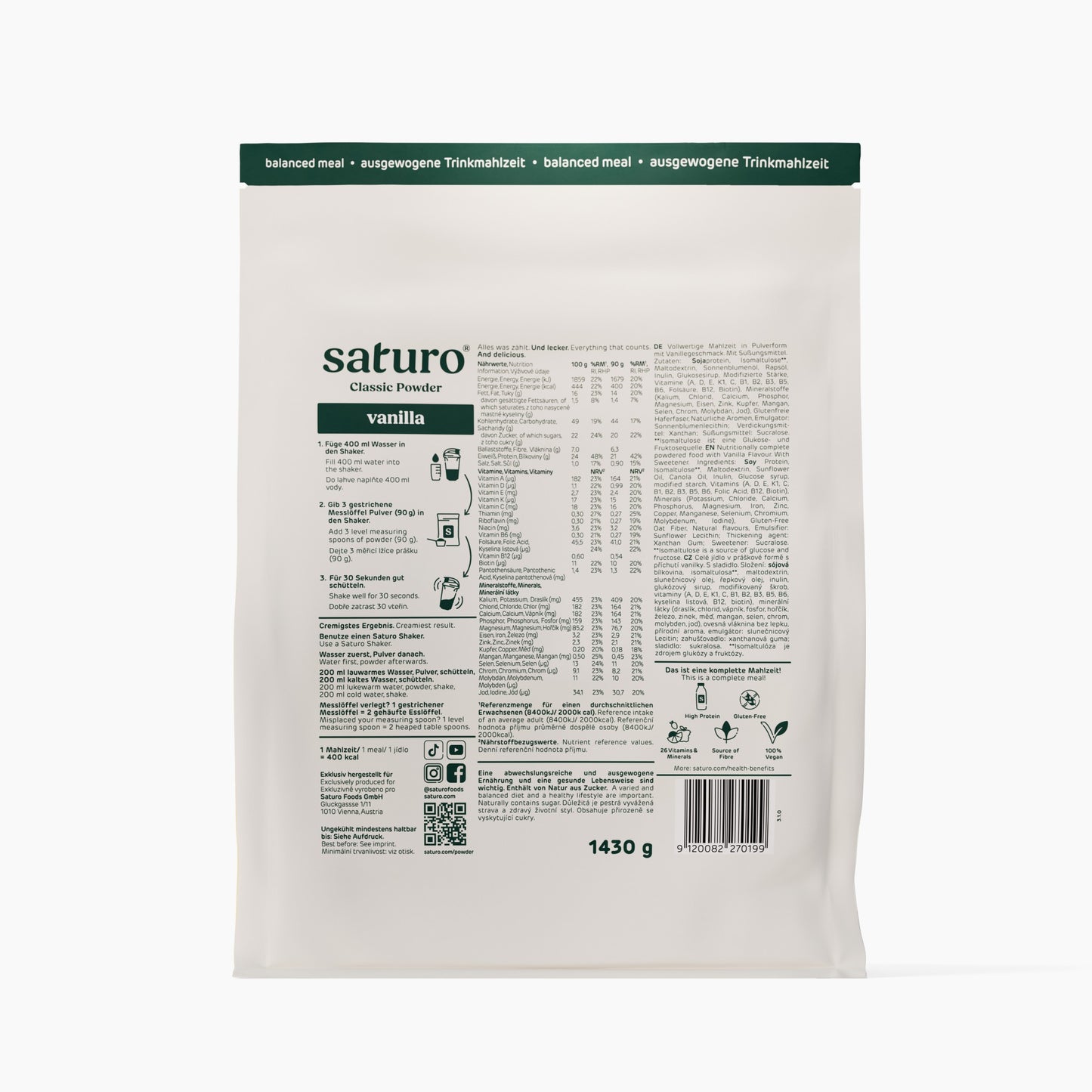 25 g of protein, complex carbohydrates, all 26 essential vitamins & minerals and saturates up to 5 hours. Naturally vegan.