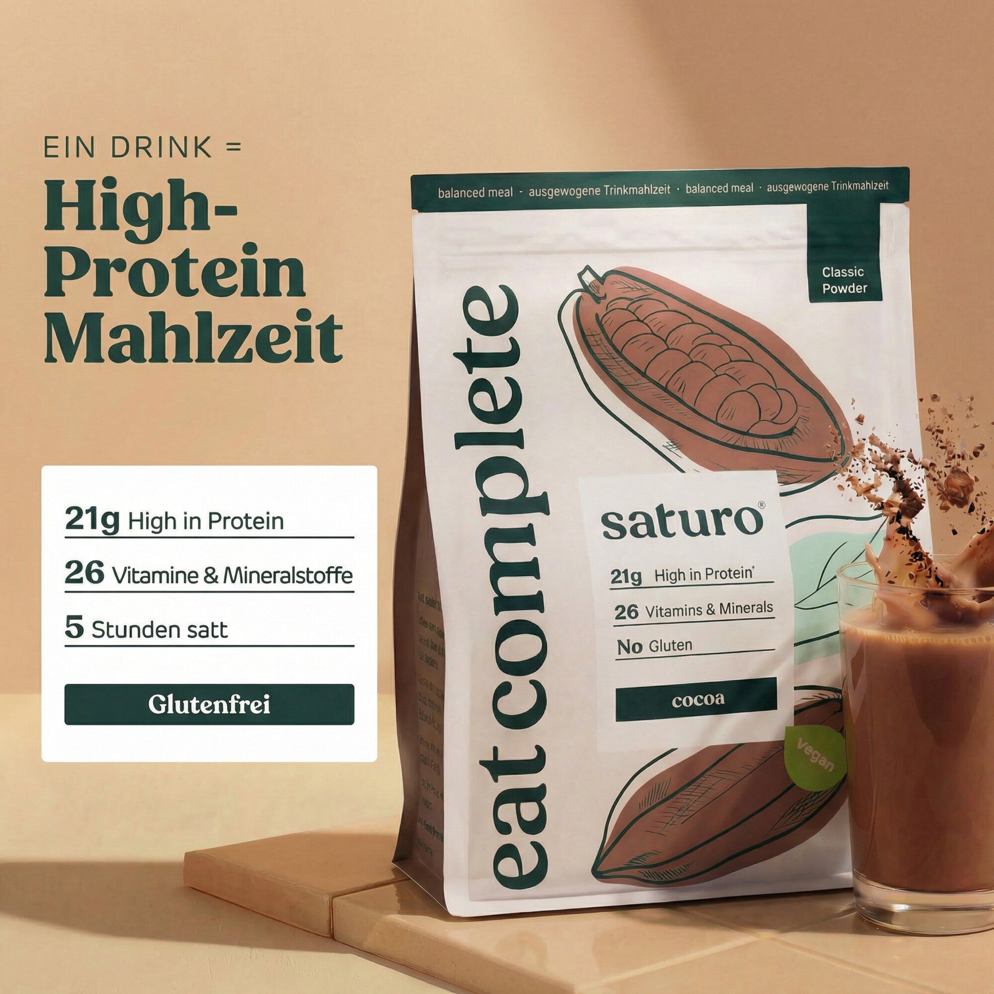 The Saturo Classic Powder is our cheapest product with a price of only €1.87 per shake. It is gluten-free and contains 21 g protein and all 26 vitamins and minerals